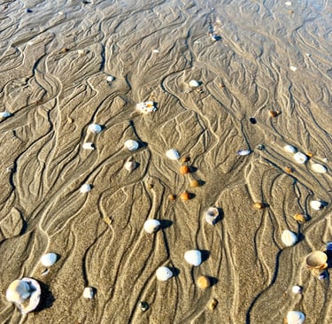 Die beim Wandern hinter mir zurückgelassenen Fußspuren im Sand werden von Wind und Wasser nach jedem Schritt rasch wieder verwischt.