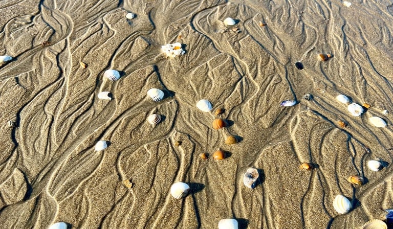 Unter meinen nackten Fußsohlen gibt der feine Sand bei jedem Auftreten weich nach, während er zugleich leicht spröde zerbröselt.